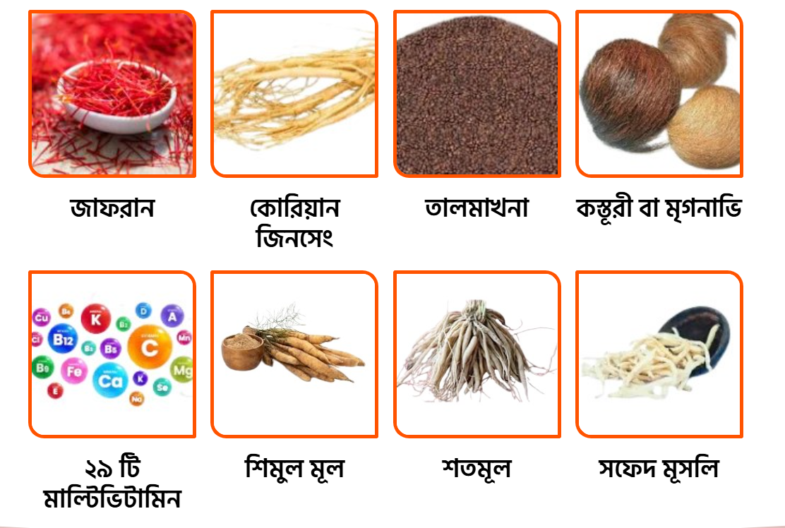 Elite Forever রয়েছে মাল্টিভিটামিন এর ৪৯টি উপাদান আছে জিনসিং, আলকুশি, সাফেদ মুসলি, পানিফল, শিমুল মূল, শতমূল, তালমাখনা, মাশরুম, আখরোট, আফ্রিকান খুসিলা, কস্তুরী এর মতো মহামূল্যবান বহু উপাদান